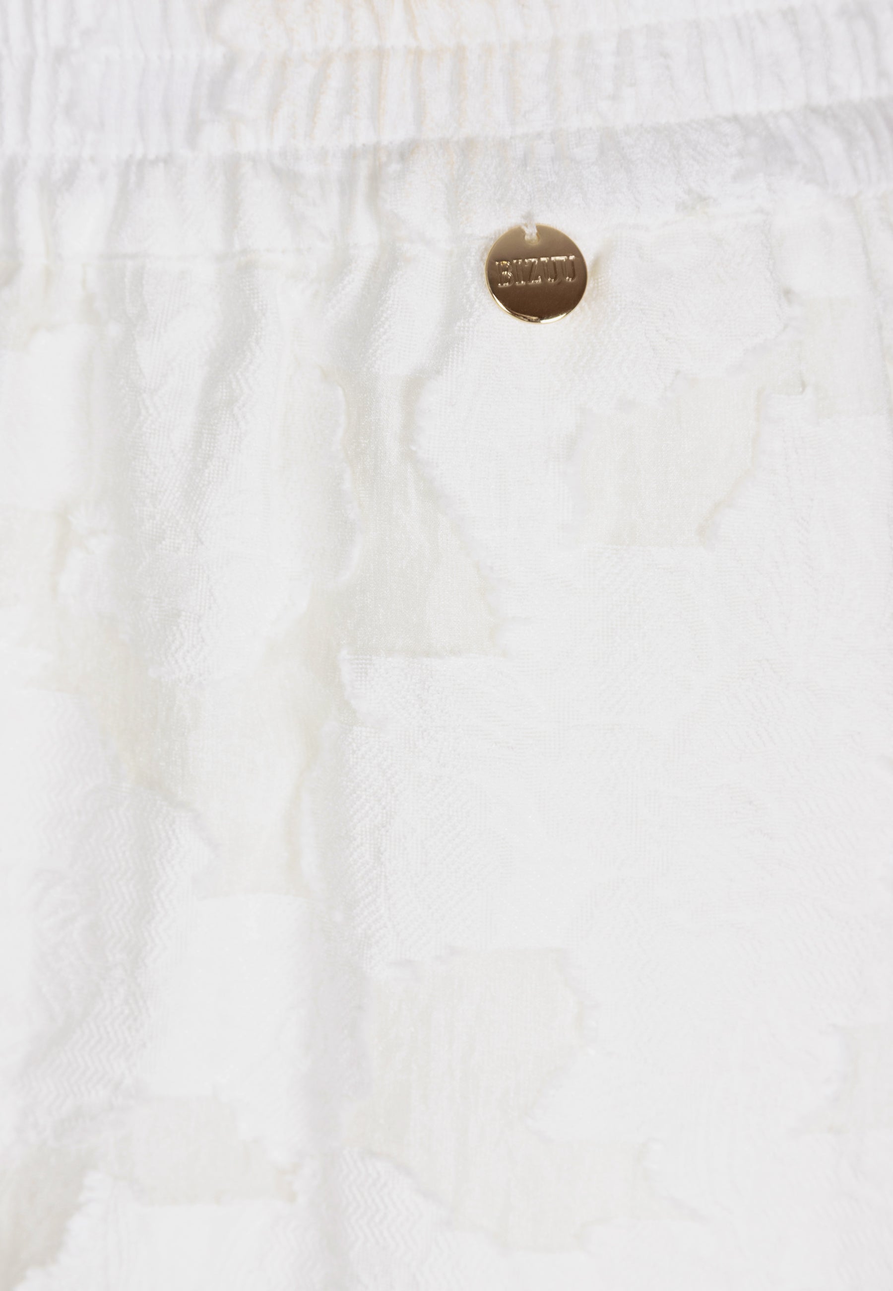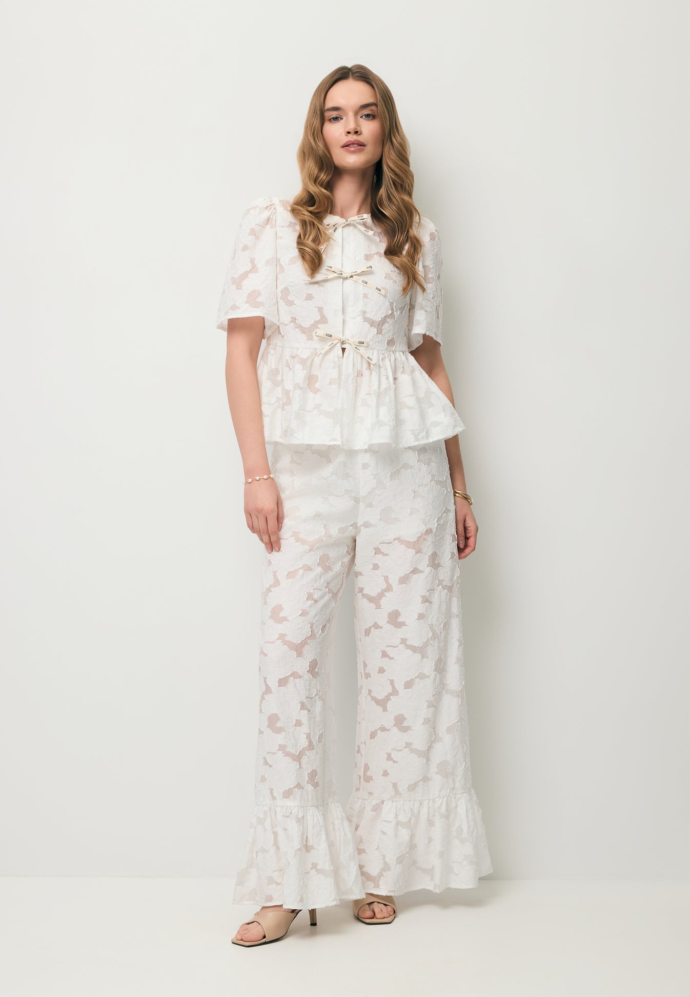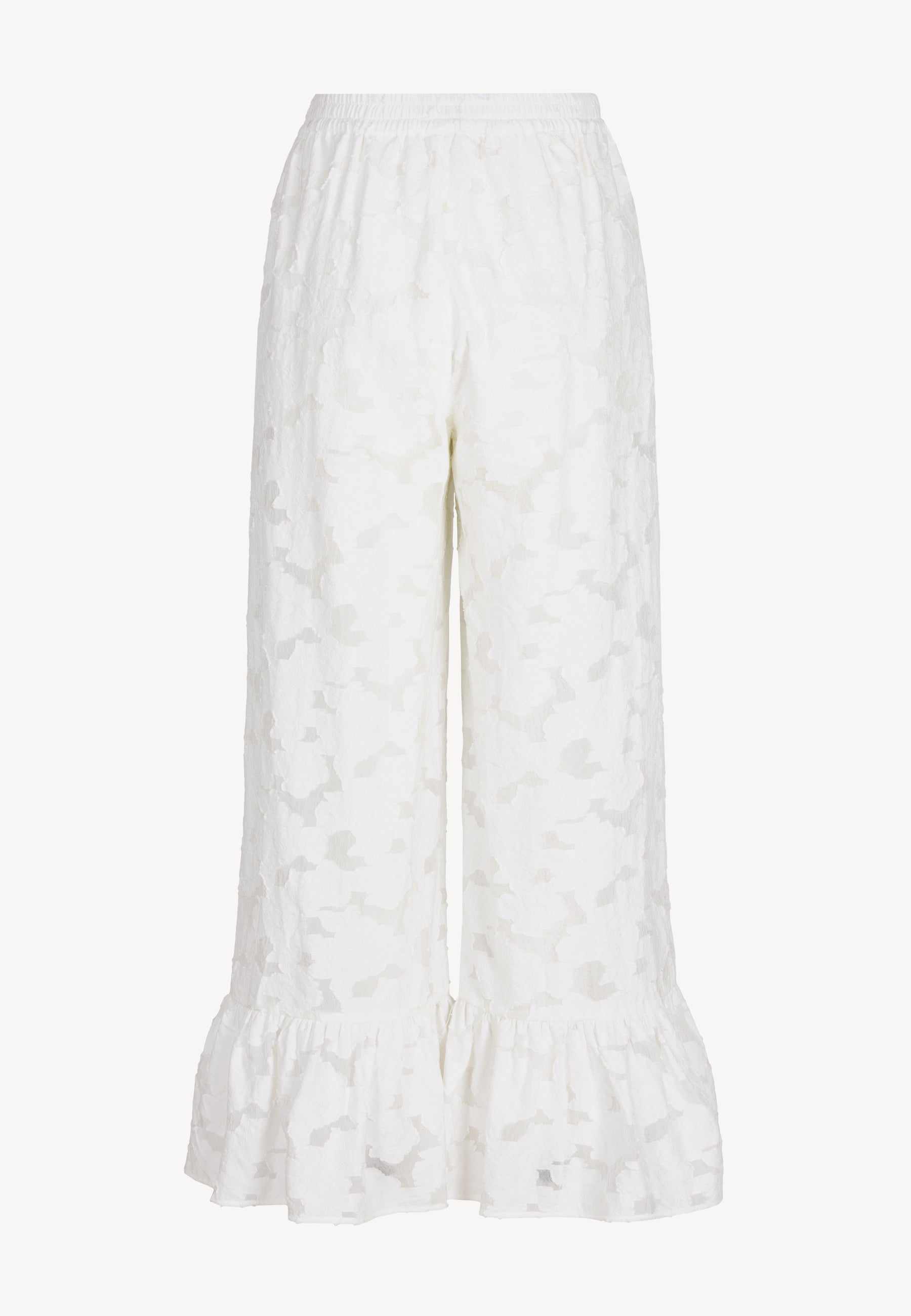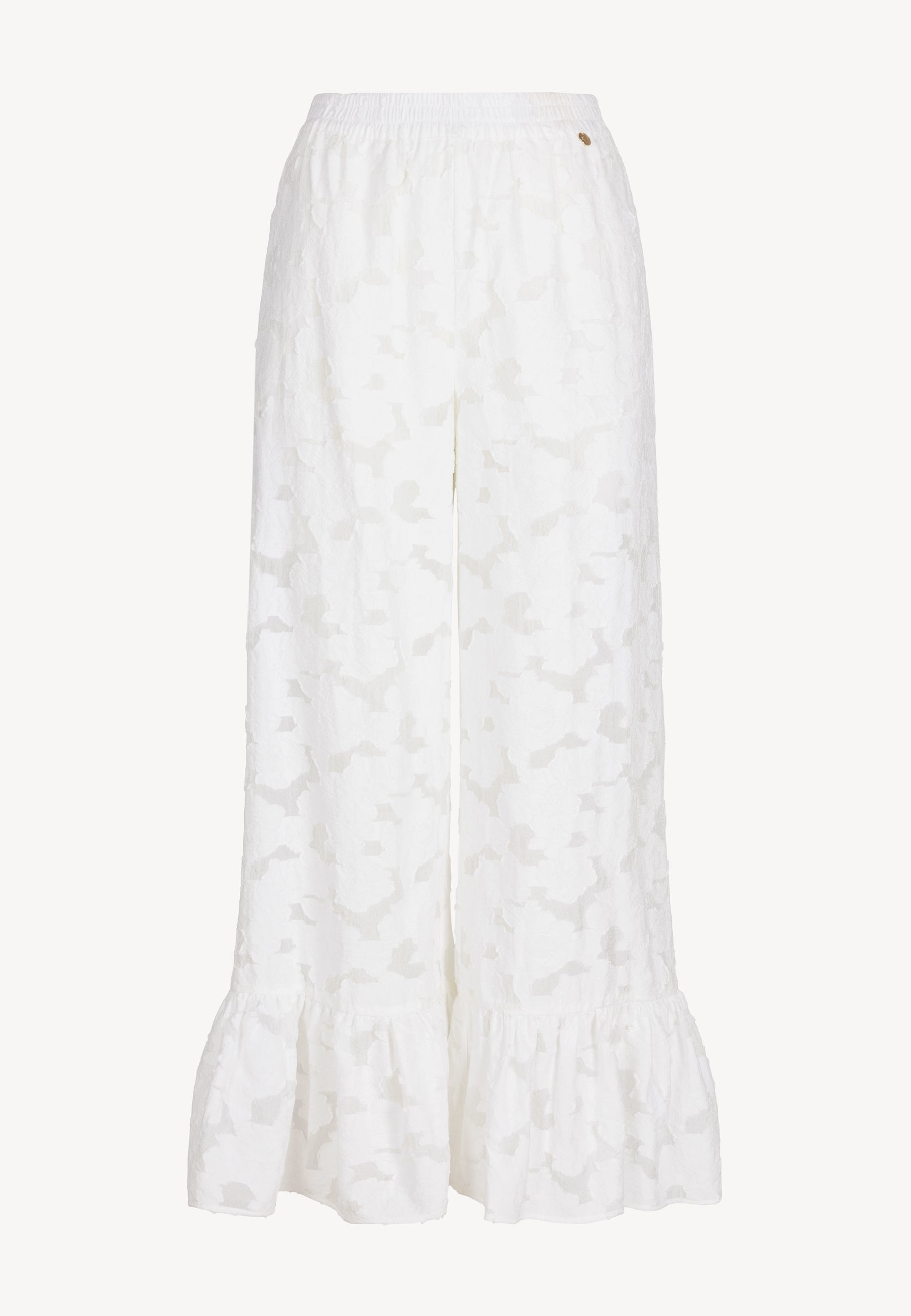 Spodnie LAVENDOU w kolorze kremowym to doskonały wybór dla kobiet ceniących wygodę i elegancję. Wykonane ze strukturalnej tkaniny w kwiatowy wzór, posiadają gumę w pasie oraz szeroki krój, który zapewnia swobodę ruchów. Nogawki w dole zostały ozdobione szeroką falbaną, dodając spodniom lekkości i dziewczęcego uroku. Częściowa podszewka gwarantuje komfort noszenia. Spodnie LAVENDOU to idealny wybór na wiele różnych okazji, dodając stylizacji subtelny i wyjątkowy charakter.