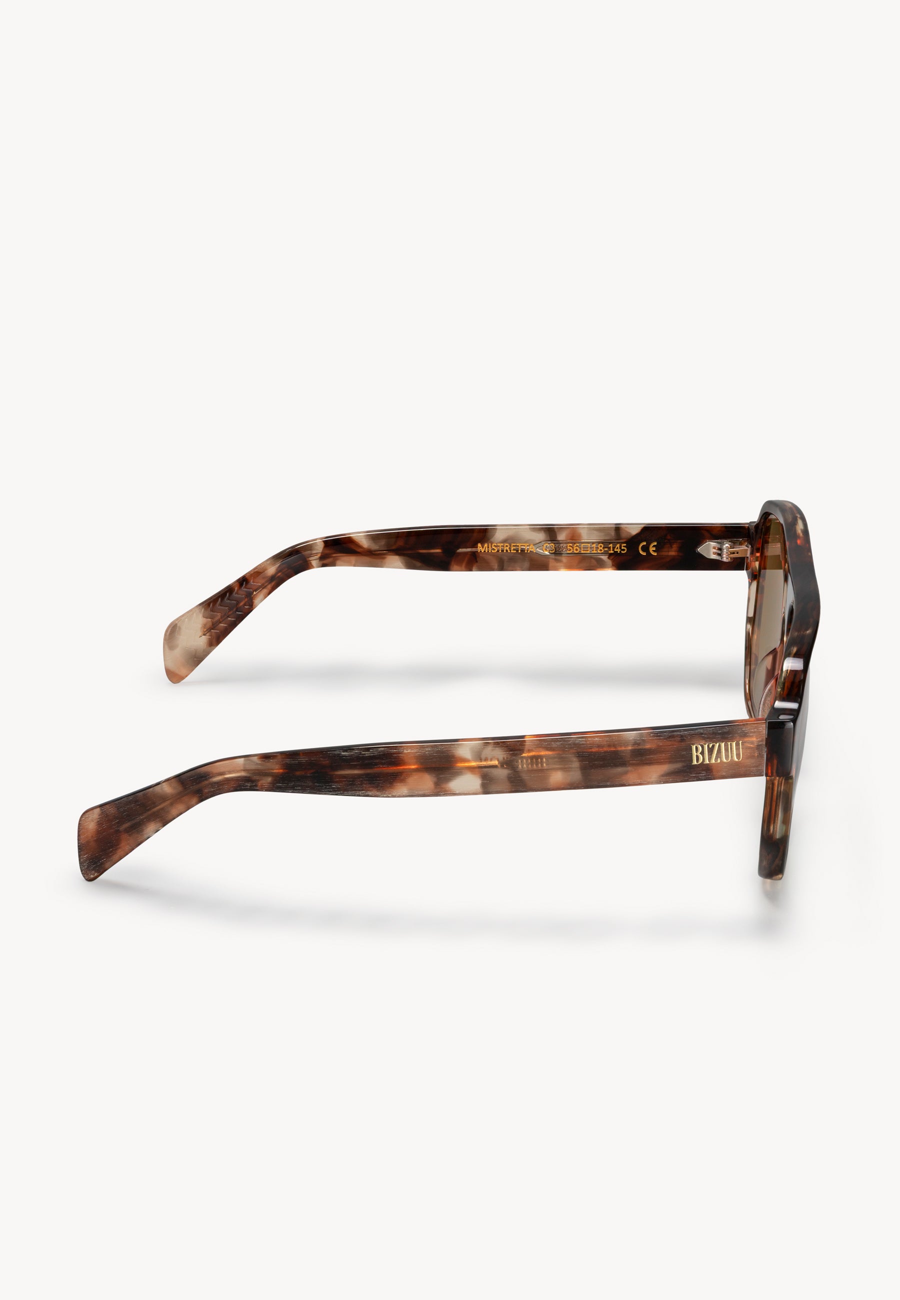 Okulary przeciwsłoneczne MISTRETTA to eleganckie dodatki, które zwrócą uwagę każdej kobiety. Geometryczna oprawka w kolorze szylkretowym doskonale komponuje się z karmelowymi soczewkami, podkreślając indywidualny styl noszącej je osoby. Subtelne złote logo BIZUU umieszczone na bokach dodaje im luksusowego charakteru. W komplecie z okularami znajduje się etui oraz ściereczka, oba ozdobione logo marki. Dzięki nim ochronisz swoje okulary w podróży i zachowasz ich nieskazitelny wygląd.