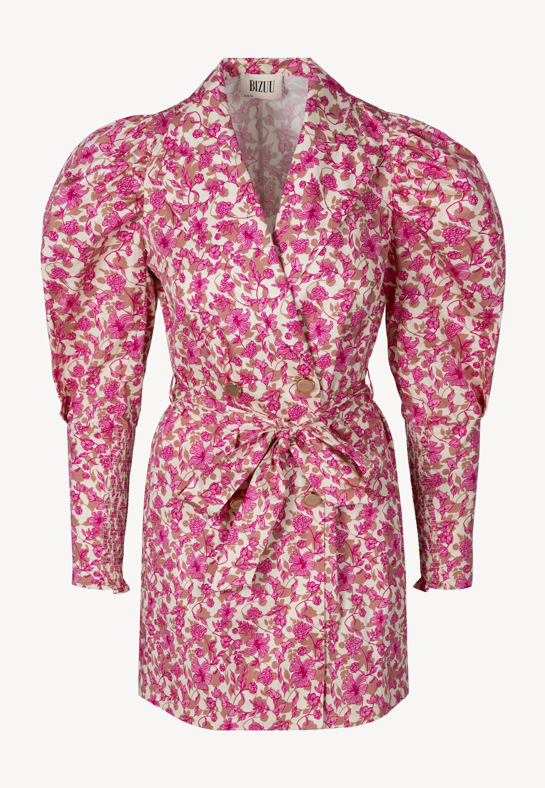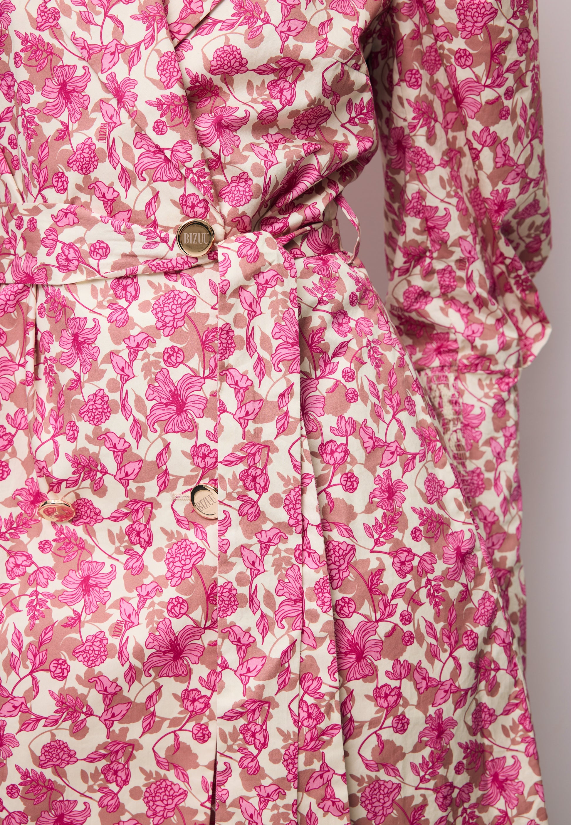 Sukienka GEORGINA to wyjątkowe połączenie elegancji i nowoczesnego designu. Fason inspirowany dwurzędową marynarką pięknie podkreśla sylwetkę, a pasek z tej samej tkaniny pozwala zaakcentować talię. Autorski kwiatowy print nadaje całości kobiecego i oryginalnego charakteru, a złote guziki z logo BIZUU stanowią luksusowy detal przyciągający uwagę. Bufiaste rękawy wykończone panelem gumonici dodają lekkości i modowego wyrazu, czyniąc sukienkę idealnym wyborem zarówno na wyjątkowe okazje, jak i stylowe wyjścia na co dzień.